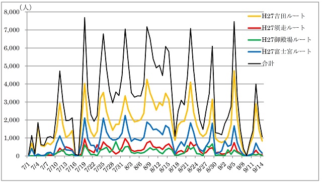 ※7/1、7/16、7/17、9/9は台風等による荒天のため、登山者が非常に少なかった。これらの日はスバルライン(吉田ルートへの接続道路)も荒天のため通行止め。