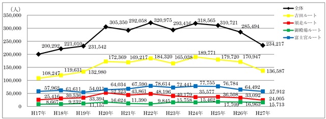 図1:富士山の全登山者数及び各登山道別登山者数の推移