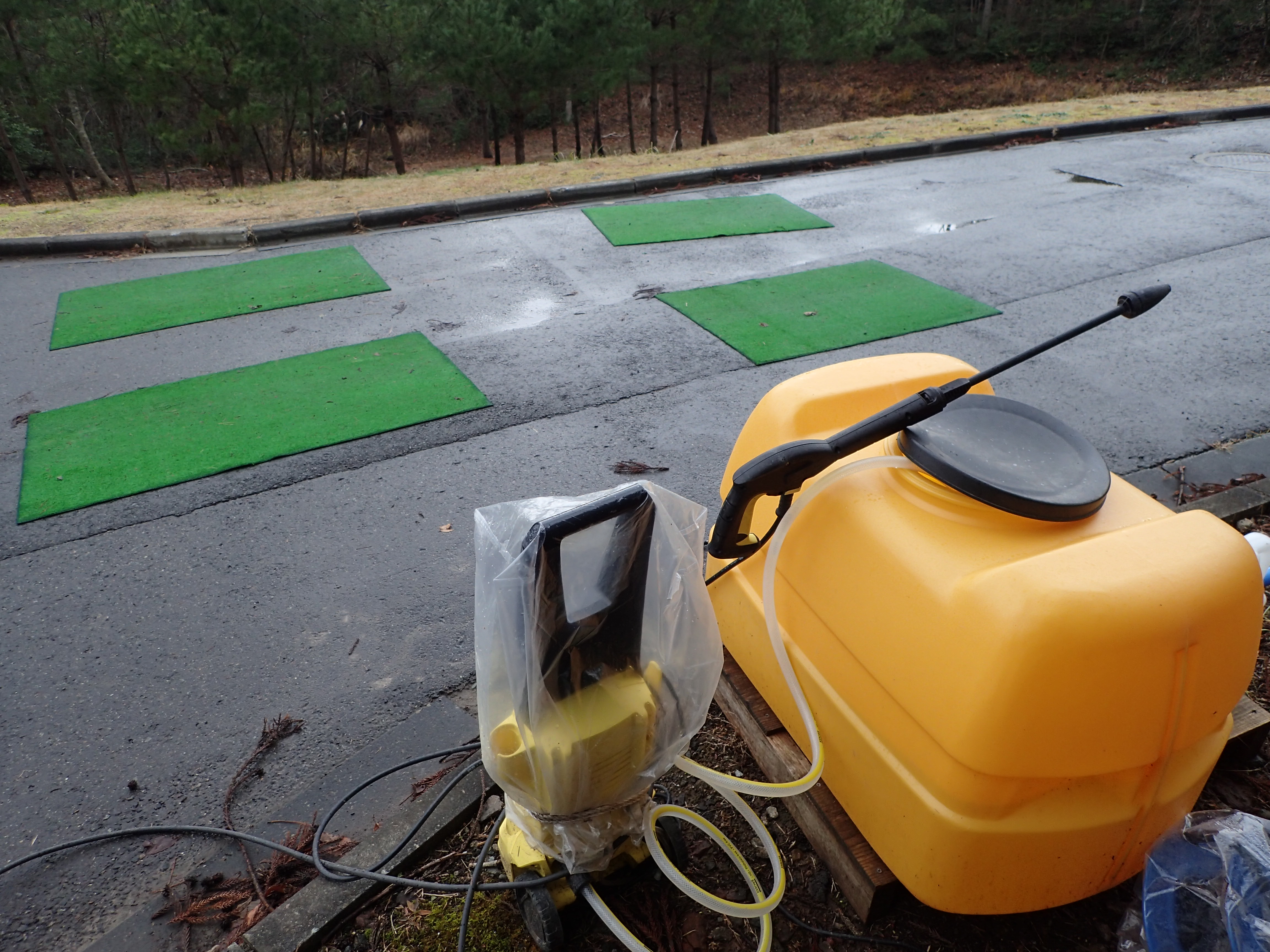 【ゲートや管理棟入り口に設置している靴底の消毒槽】 【車両用消毒液噴霧器】