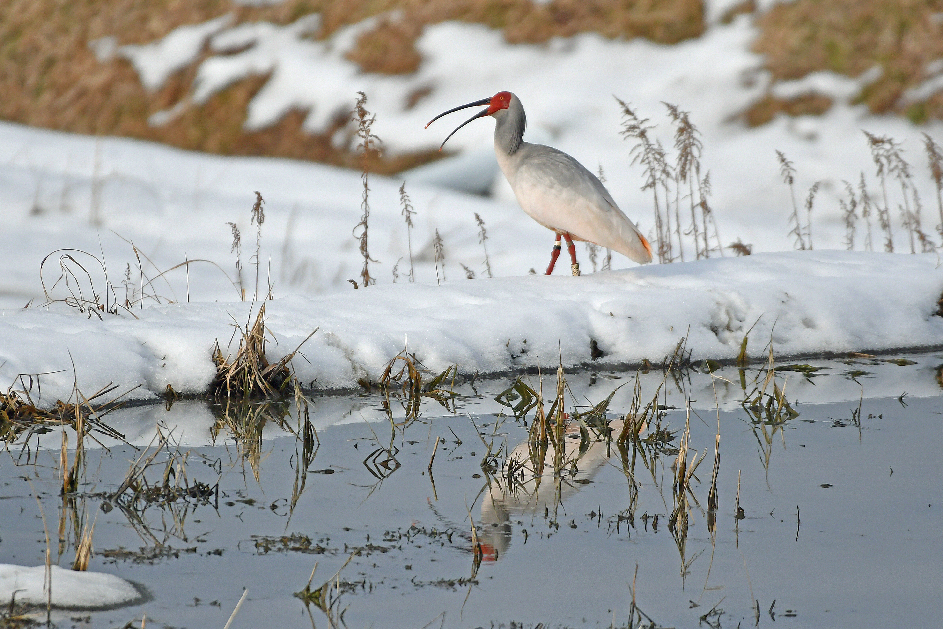 一方、真っ白な景色とは対照的に、トキは今、だんだんと暗い色の羽に変化しています。