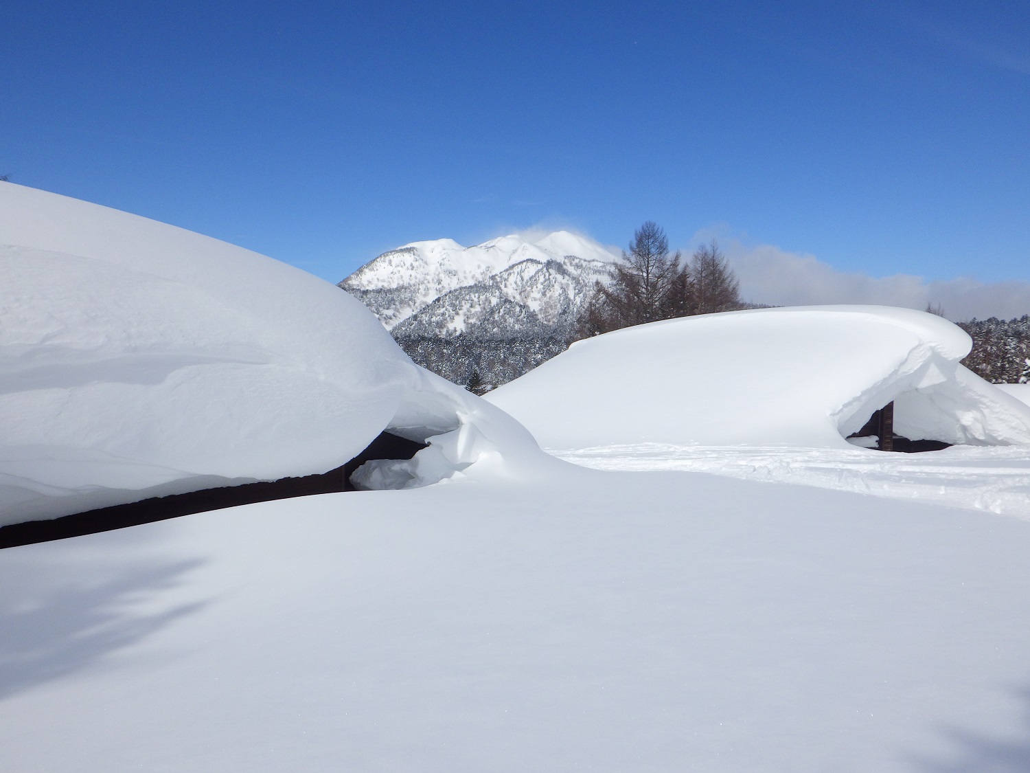 新ビジターセンターと旧ビジターセンターに分かれて、それぞれ屋根の雪下ろしにかかりました。パワーのある村の若い人はスコップやスノーダンプでガンガン雪を落としていきます。私は旧ビジターセンターにまわりましたが、掘っていくと堅くて重い雪の層に当たり、なかなかはかどりません。建物周りは歩くと埋まってしまうような深雪でしたが、除雪機のお陰でいつの間にか立派な道がついており、行き来がだいぶ楽になりました。