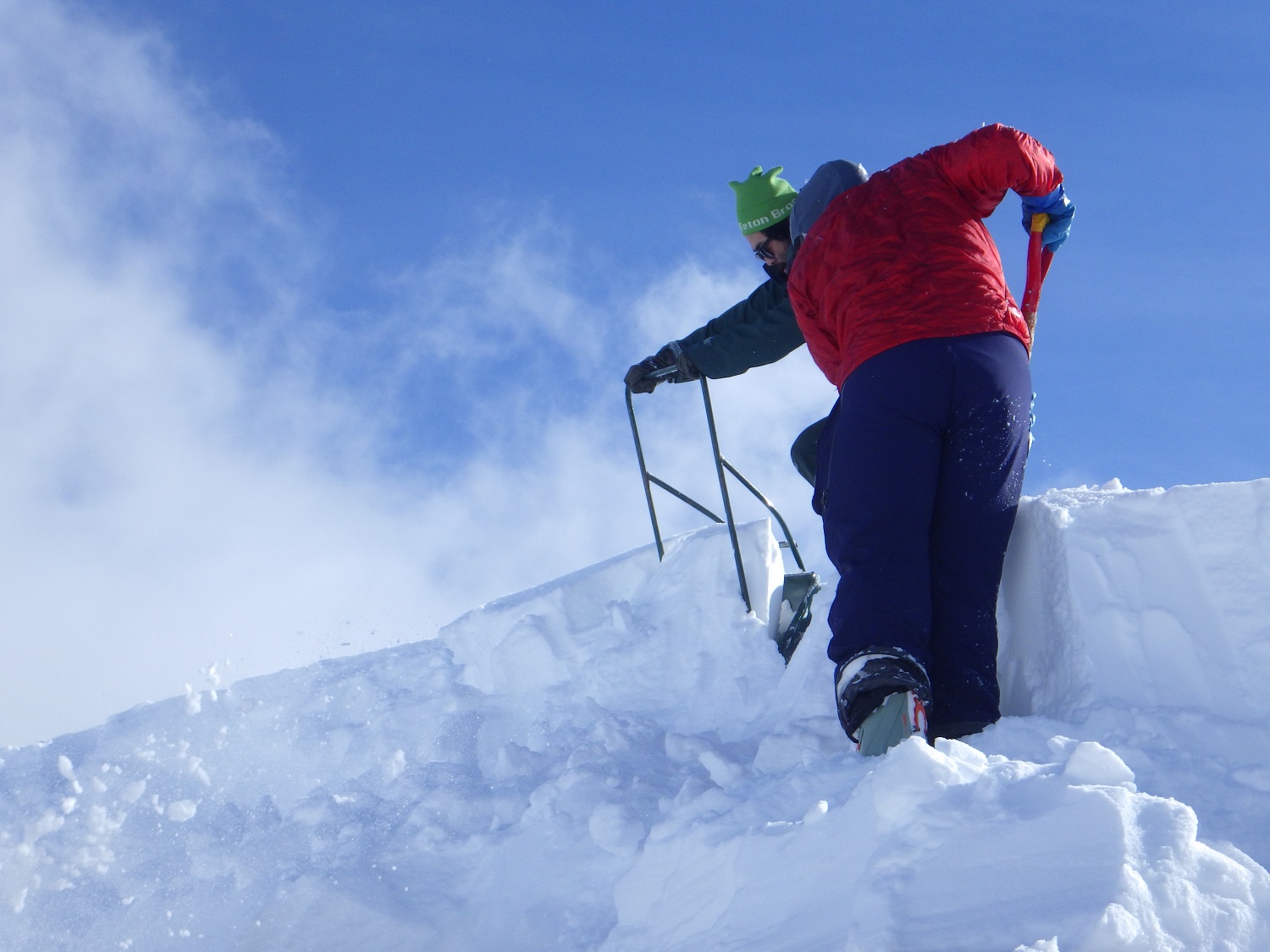 旧ビジターセンターで大変だったのは屋根からぶら下がった雪庇(せっぴ)落としです。最後に残ったものは長さが3mにもなり、スコップではどうにもならないので、スノーソー(ロープに歯を付けたもの)を使って切り落としました。
