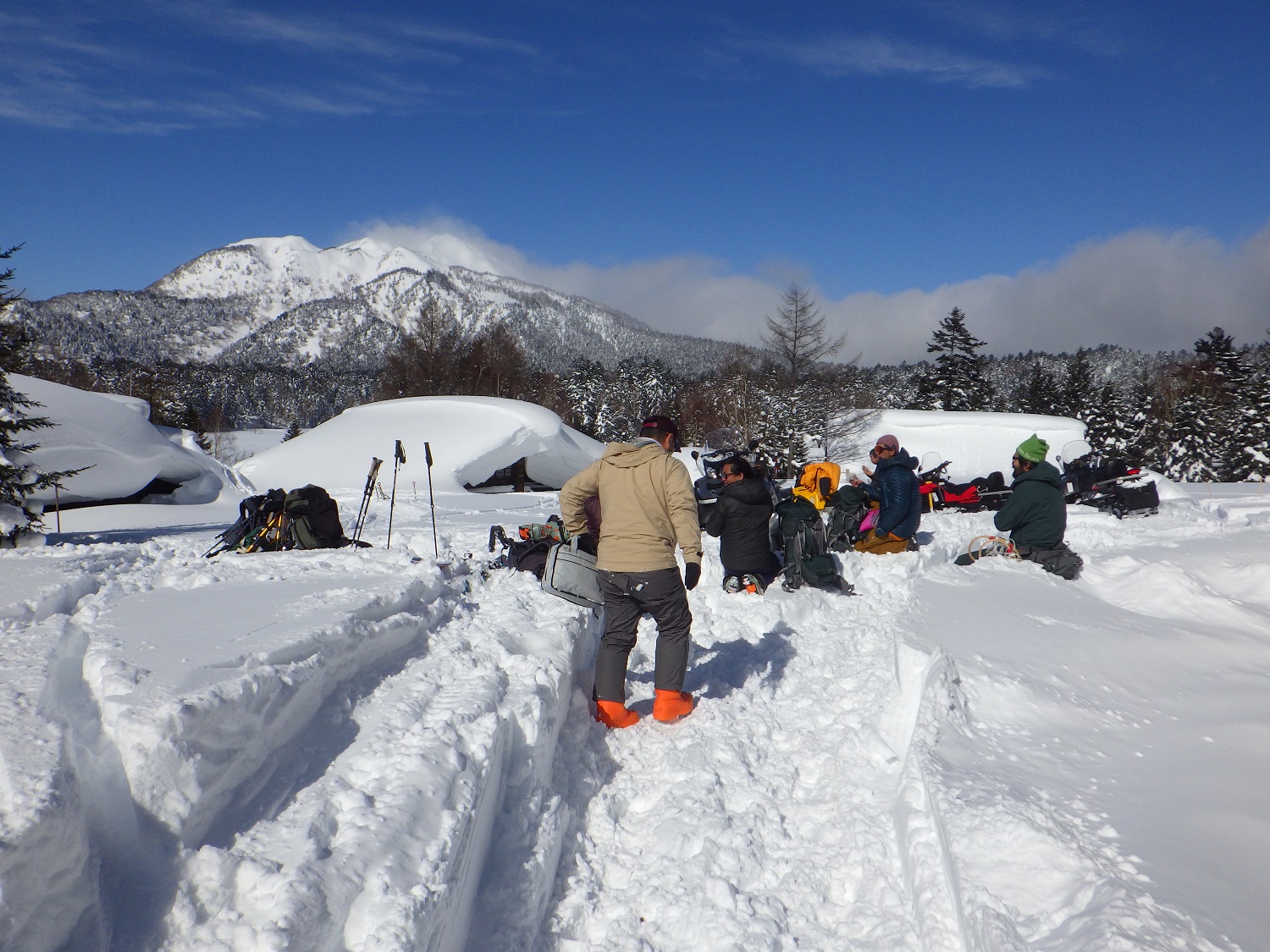 雪上車は約2時間かけて沼山峠に到着しました。ここからは各人スキーに履き替えて沼を目指します。先行したモービルはそのまま沼に向かうことができたようで、峠には残っていませんでした。深雪の中、沼を目指して登り始めましたが、モービルの跡は雪が踏み固められているので、楽に歩くことができました。大江湿原まで降りてくると、モービルが迎えに来てくれたので、沼まで同乗させてもらいました。