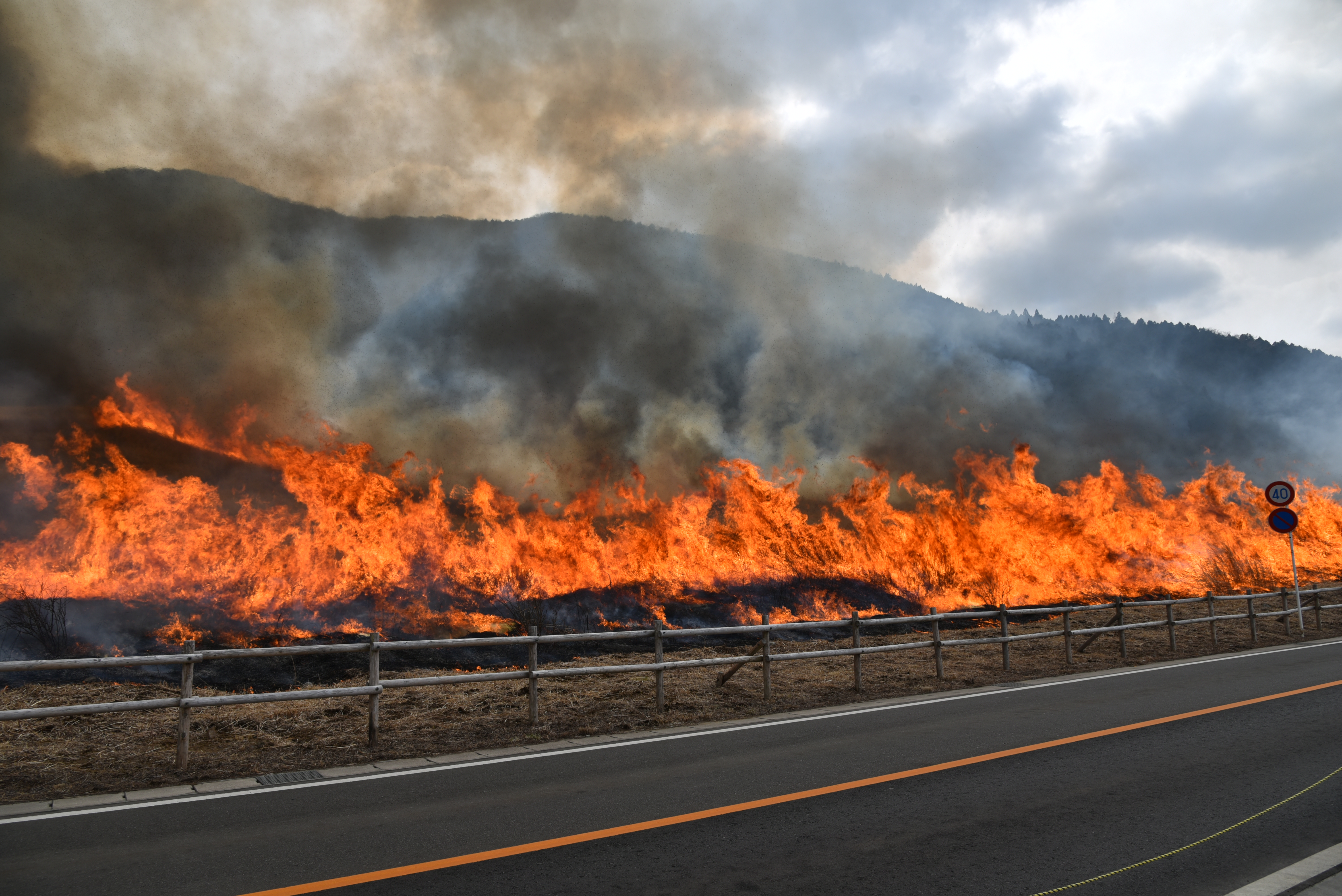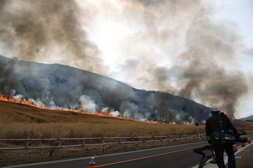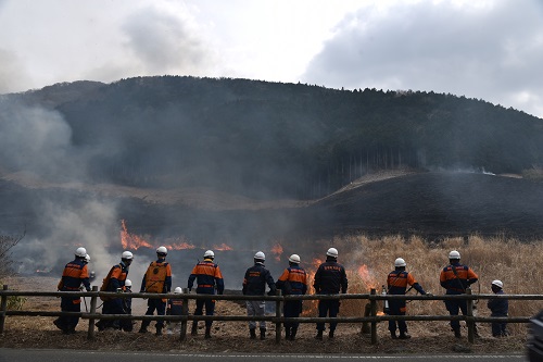当日は朝7時に、天気の状態を確認して実施の判断がされました。ススキ草原に隣接する県道75号線は通行止めとなり、多くの警察や消防隊の皆さんがヘルメット着用で作業を進め、緊張感も感じられる中で煙が上がり始めました。周囲の森などを焼かないように、初めに防火帯(事前に5~10m幅でススキを短く刈り込んだ部分)沿いのススキを焼いていきます。