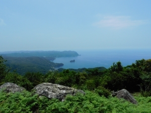 北側展望台からの景色です。やはり少々霞んでいますが、伊豆半島の山々や複雑な海岸地形、西伊豆(雲見や堂ヶ島など)の町並みを望むことができました。