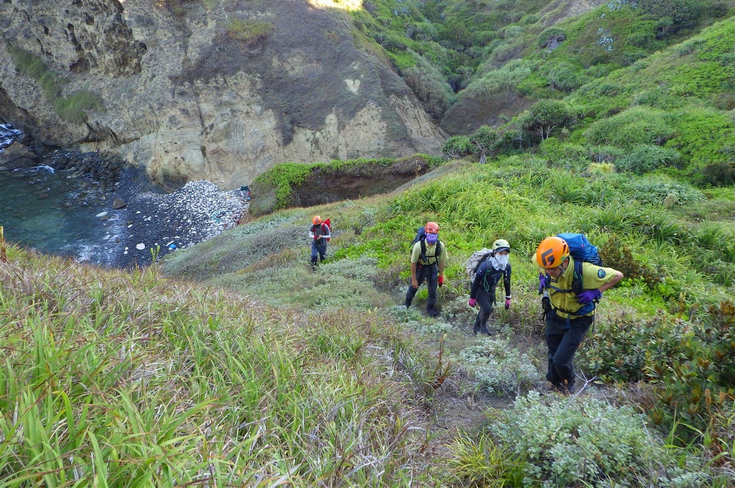 作業当日は午前4時30分に事務所を出発。船に乗る前には、履物や荷物に母島の生物が付着していないかを入念にチェックします。船に揺られること1時間ほどで、姪島の上陸地点に到着します。船は沖に停泊して、その先は小型の伝馬船に乗り換えて石が転がる浜に上陸します。浜で装備を整えて、すぐに作業地点へ移動開始です。台地に上がるころにはすでに汗びっしょりです。