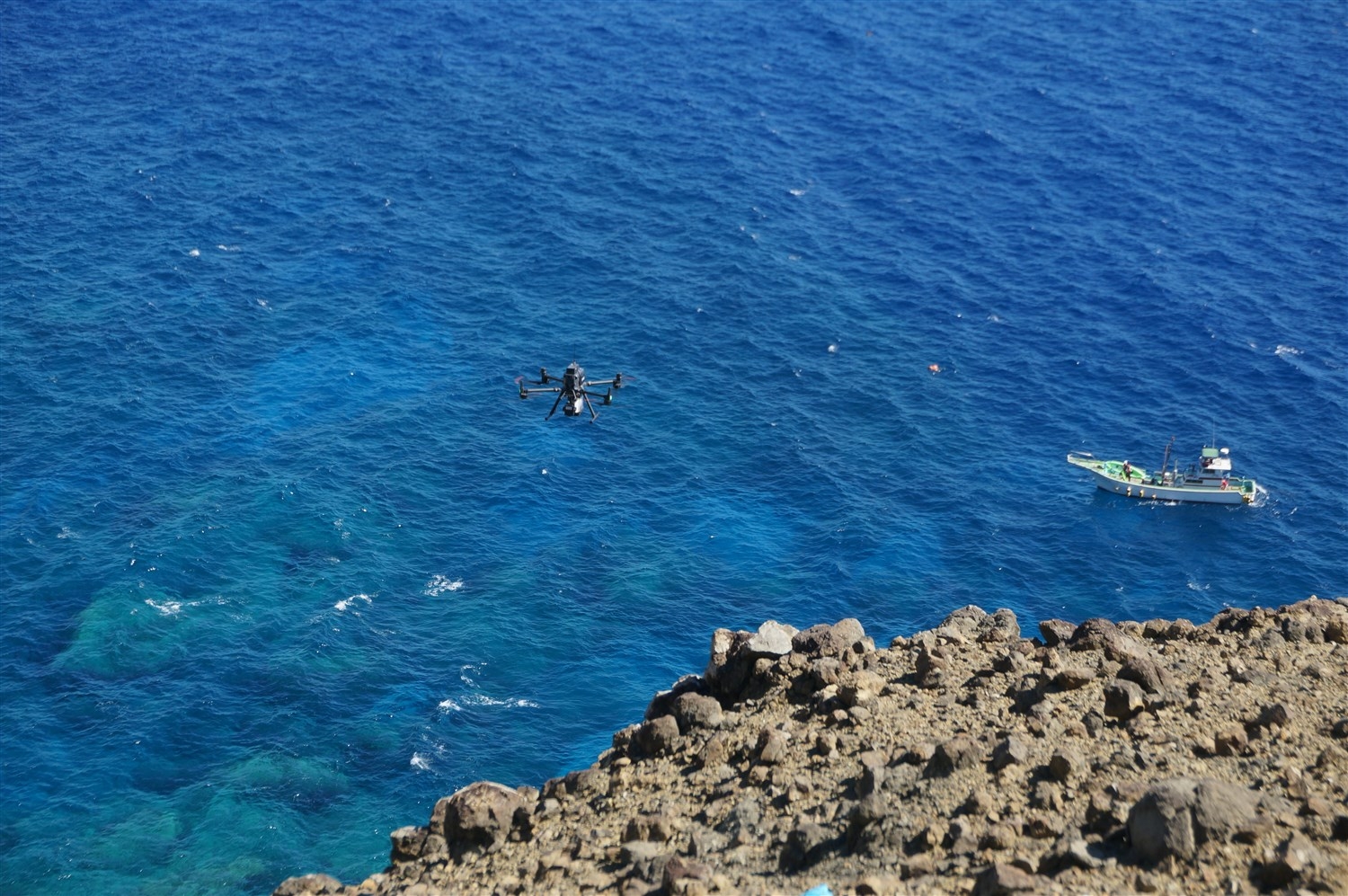 サポート役は、バッテリーや殺鼠剤の運搬のほか、殺鼠剤散布装置への装填、船との無線連絡などを担当します。ドローンは姪島島内から離発着しますが、送信機とドローンの間に障害物がある場合、操縦が不可能になるため、海岸沿いを飛ばす場合、陸地から離陸させた後に操縦権限を船上の操縦者へ移し、そこからドローンに搭載したカメラの映像を確認しながら散布地点に投下をします。