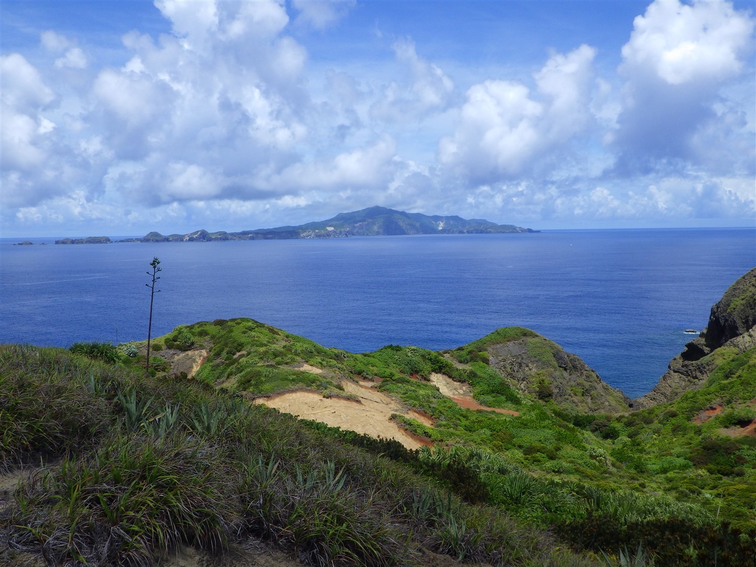 現場までの道のりは、多様な景観が現れます。崖際の急坂やトラバースに始まり、土や岩が露出した裸地、乾性低木林を縫うように進みます。沢沿いにはタマナを中心とした薄暗い森があり、島の東部に至るとオガサワラススキが広がる草原植生が現れます。リュウゼツランがたくさん花や実をつけている様子、赤色の砂が露出した裸地がパッチ状にいくつか広がる景観は、姪島に独特な雰囲気を与えています。一方、植物の基本構成は小笠原諸島全体で大きく変わらないためか、普段私が父島列島で見ている植物種も多く見られたのは興味深かったです。