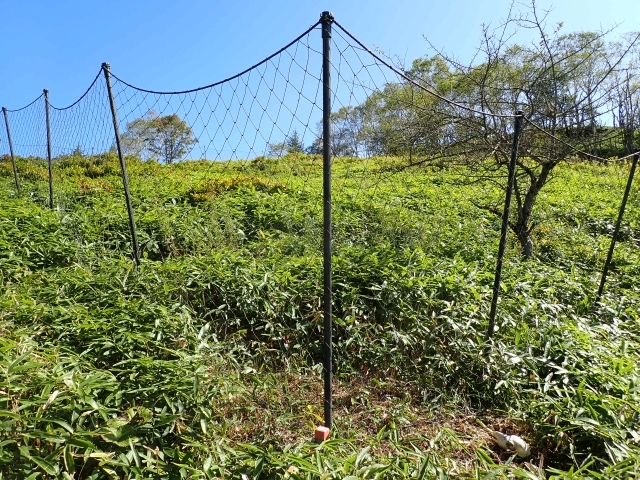山小屋の方から「シカが網を食いちぎって穴を開けてしまう」という話を伺ったこともありましたが、見てみると確かに穴が開いているところや、地面と固定している杭が抜けているところがあります。防鹿柵に沿って一周しながら補修を行いました。