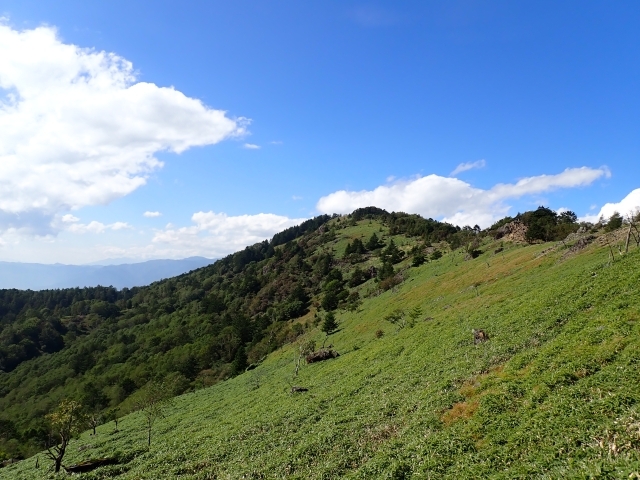 稜線に戻ってふと見上げると、大菩薩嶺の向こうに奥秩父主脈の山並みが広がっていました。