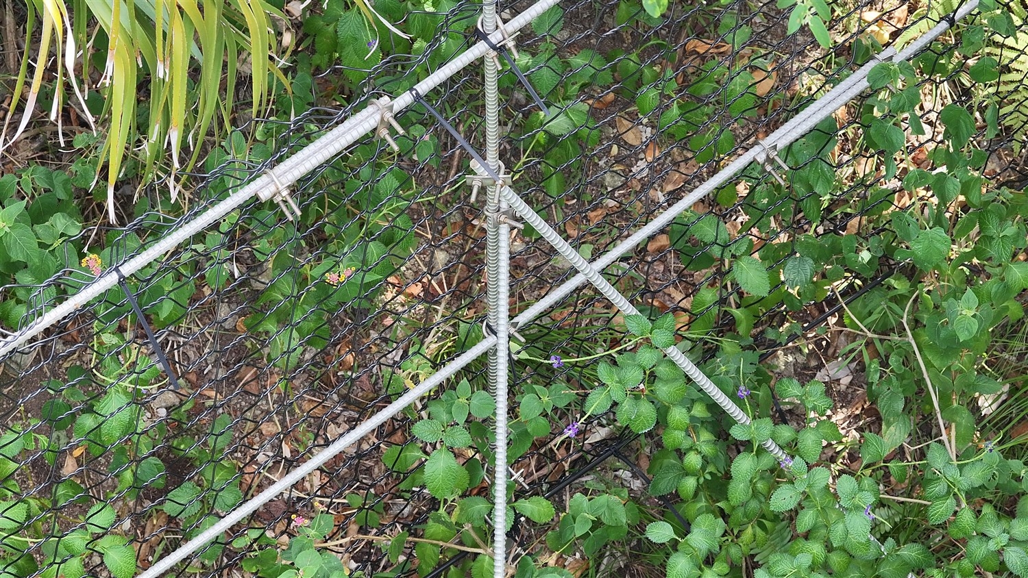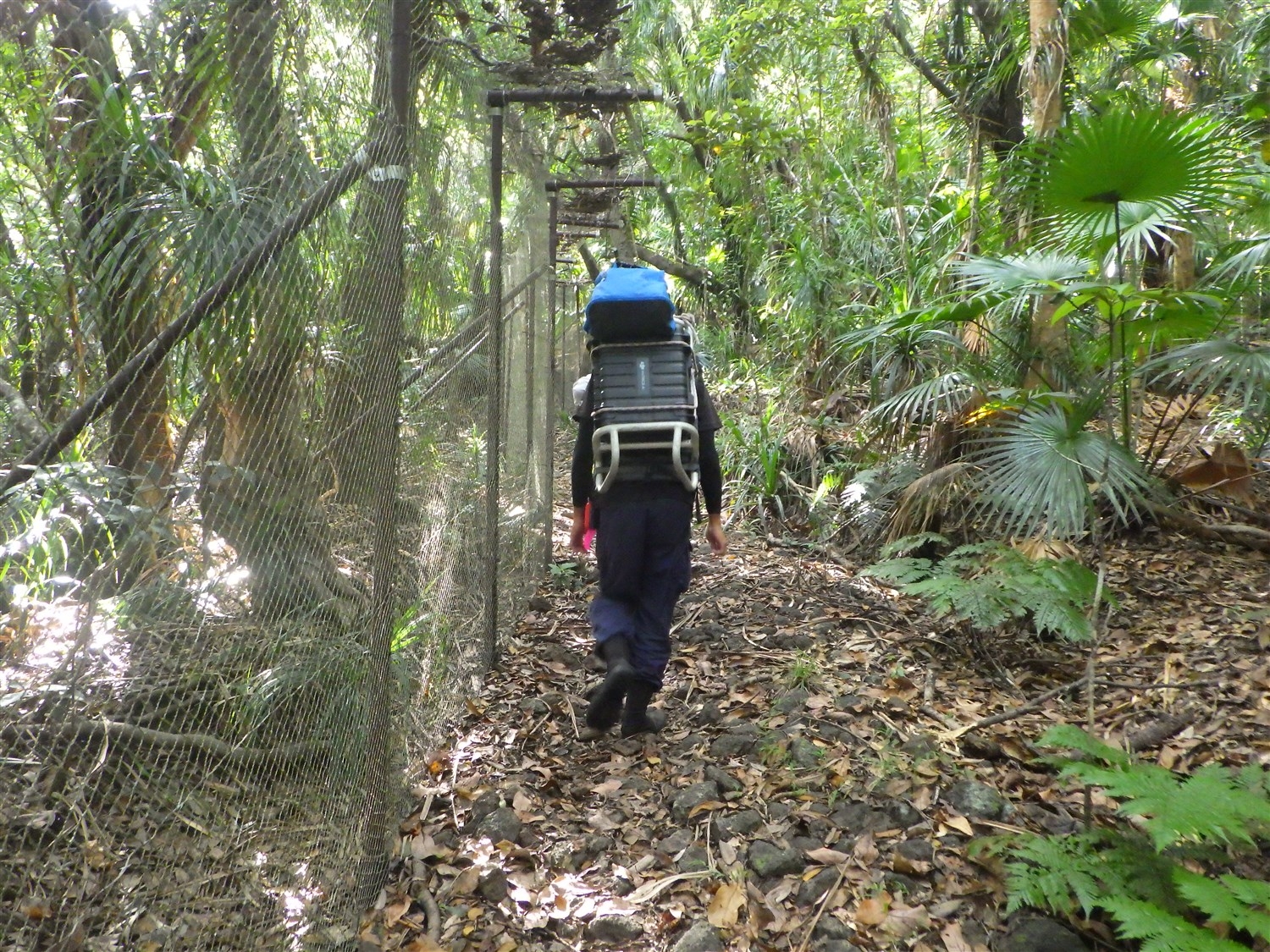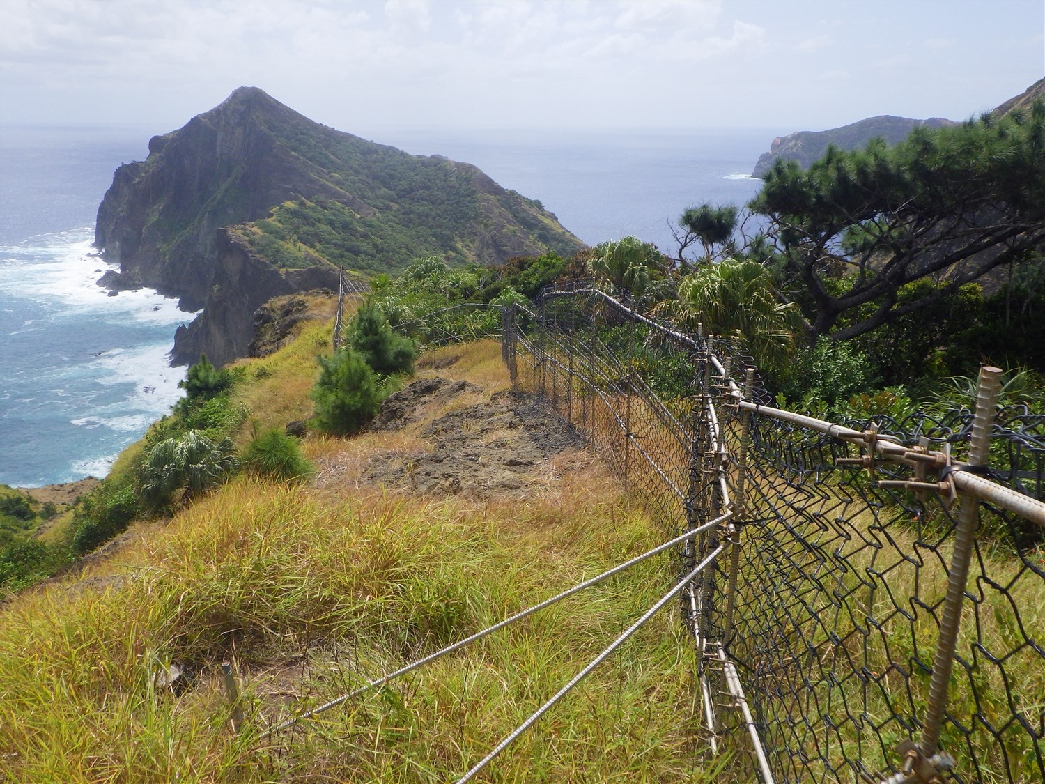 父島の東平自然再生区は、希少植物やアカガシラカラスバト、海鳥など を外来種であるノヤギやノネコから守るため、周囲を約5.3kmの柵と海で囲っています。柵は、外来種の侵入を防ぐ重要な役割を担っており、定期的に職員や委託事業者によって目視で点検を行っています。