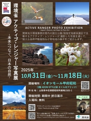 富士箱根伊豆国立公園の富士五湖管理官事務所では、秩父多摩甲斐国立公園の奥多摩自然保護官事務所と合同で、「アクティブ・レンジャー写真展」 を開催しています。写真展のテーマは、「-未来へつなぐ日本の自然‐」。