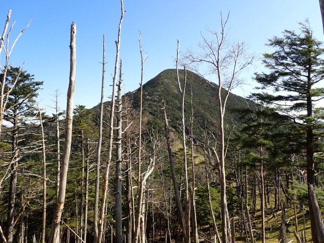 日本三大峠の一つとして知られている雁坂峠から雁坂嶺に向かう稜線では、立ち枯れの木々と背景の青空が印象的です。