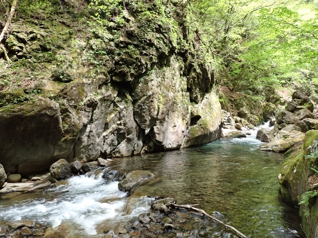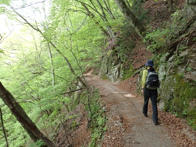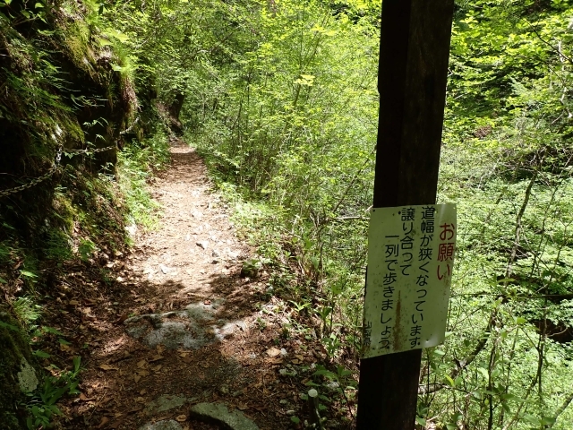 左岸側(下流を向いて左側)ではかなり水に近いところを歩きます。道が狭くすれ違いが難しい場所や、濡れて滑りやすくなっている箇所もありますので、歩きやすい登山靴やトレッキングシューズが必要です。