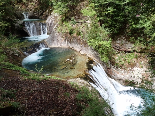 方杖橋を渡り、急な登山道を登っていくと七ツ釜五段の滝に到着します。日本の滝100選にも選ばれている西沢渓谷を代表する景勝地です。