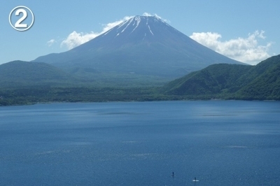 ②は富士山のふもと、中ノ倉(なかのくら)という所からのながめで、下にあるのは本栖湖(もとすこ)という富士山のふもとにある5つの湖の中の1つだよ。この中ノ倉からのながめは旧千円札の絵にもなったんだ。