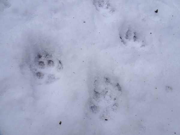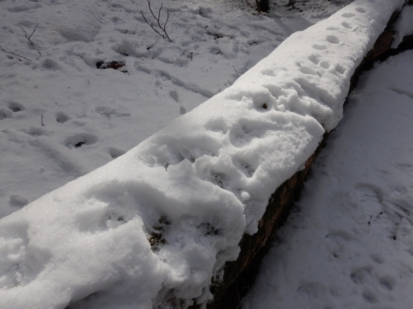 動物の足あとがあるよ。これはテンの足あとのようだね。どっちに走って行ったんだろう?他の動物もこの丸太の上を通っているよね。こうやって雪が降るとふだんはなかなか出会えない動物たちのこんせき(フィールドサイン)も見つけることができるんだよ。雪のシーズンのパトロールの大きな楽しみの1つです。