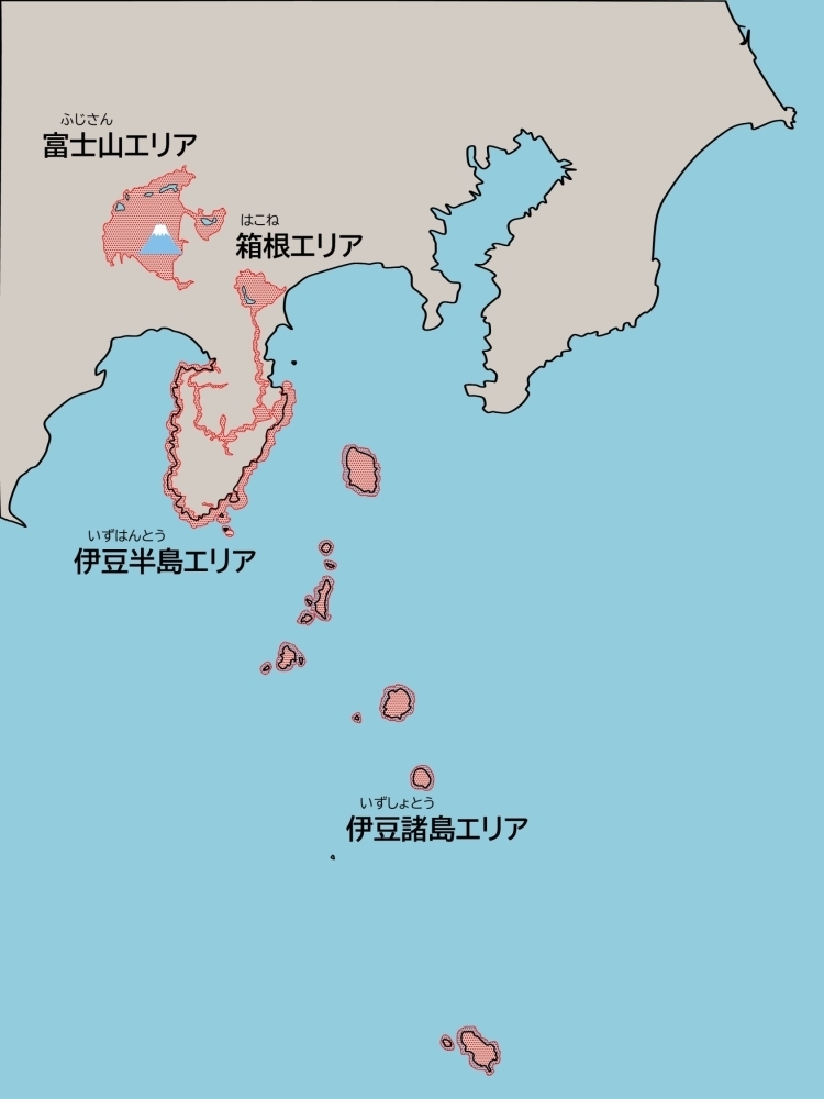 これが、その国立公園のあるところを示した地図。広いよね~。富士山だけじゃなく、箱根(はこね)や伊豆半島(いずはんとう)、それに伊豆諸島(いずしょとう)の島々も含まれているんだ。 火山でむすびつけられたこれらの地域をまとめた国立公園の名前は、「富士 箱根 伊豆 国立公園 (ふじ はこね いず こくりつこうえん) 」って言うんだ。ぜひ覚えてね。 各エリアにいるアクティブレンジャーが、今後、自慢(じまん)の景色やみんなに教えたいとびっきりのニュースを紹介(しょうかい)していくから楽しみにしていてね。 |