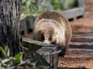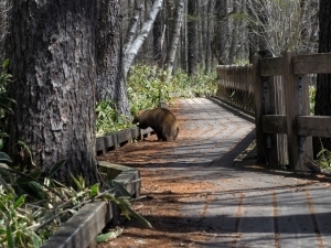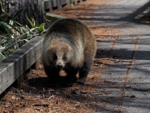 スタートからしばらく歩いた先で、木道上を何かがこっちへやってきました。