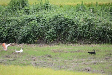 刈田で探餌しているトキを狙う黒ネコ。黒ネコは本気で襲う気は無いらしく、トキたちも距離を取りつつ、飛び去ることはしませんでした。(2015/9/7撮影)