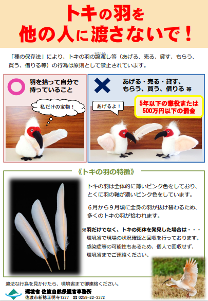 トキの羽を拾った際の取り扱い(主に種の保存法による規制)に関するチラシです。