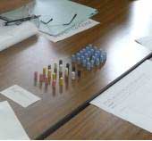 - 野山にありふれた5種類の自然物(葉っぱ・木の実など)を一定時間、見て記憶したあと、その5種類をまわりから探し出します。