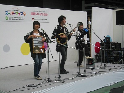 ステージにおいては、生活用品を使った楽器を中心とした童謡ジャグバンド「少年山賊団」による演奏を行いました。また、ゴムホース等を使って楽器「カズー」を手作るワークショップを開催し、参加者の方には、その後行われた演奏において一緒にカズーを鳴らしていただきました。